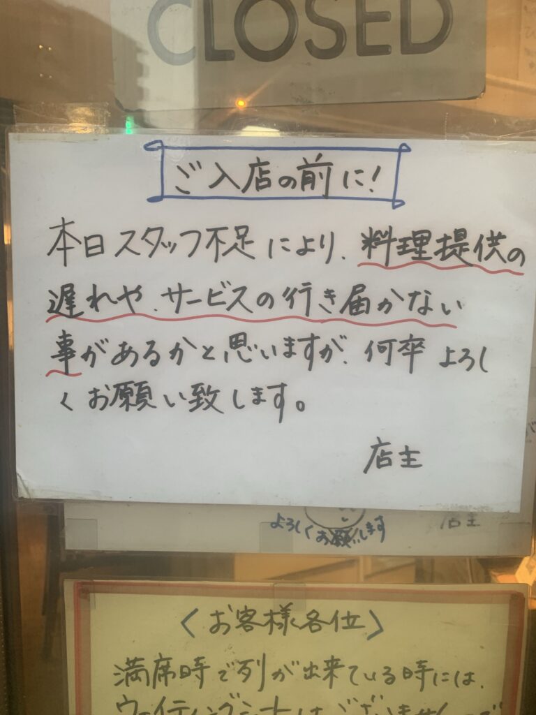 最近こんなお知らせが続いておりますが、ランチに引き続きスタッフ病欠の為、お客様には大変ご迷惑おかけしますが、お料理提供の遅れや、サービス面で行き届かないところも多くなりかと思います。