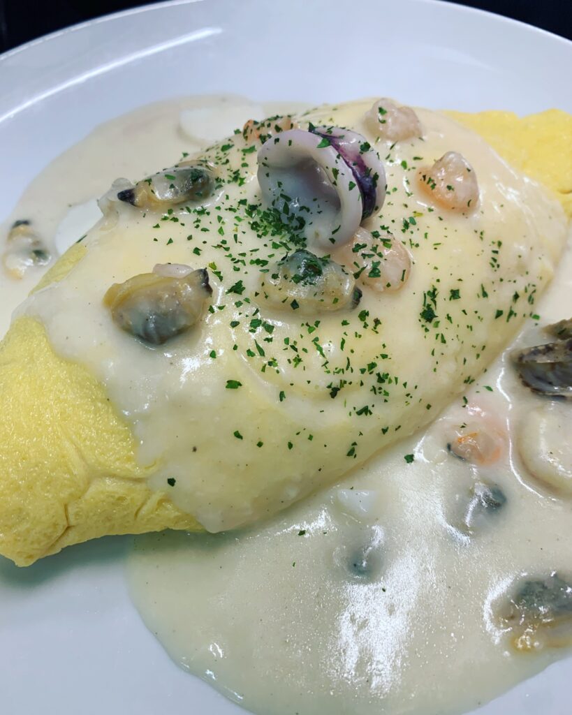 日替わりオムライスは、魚介のクリームソースオムライスです。