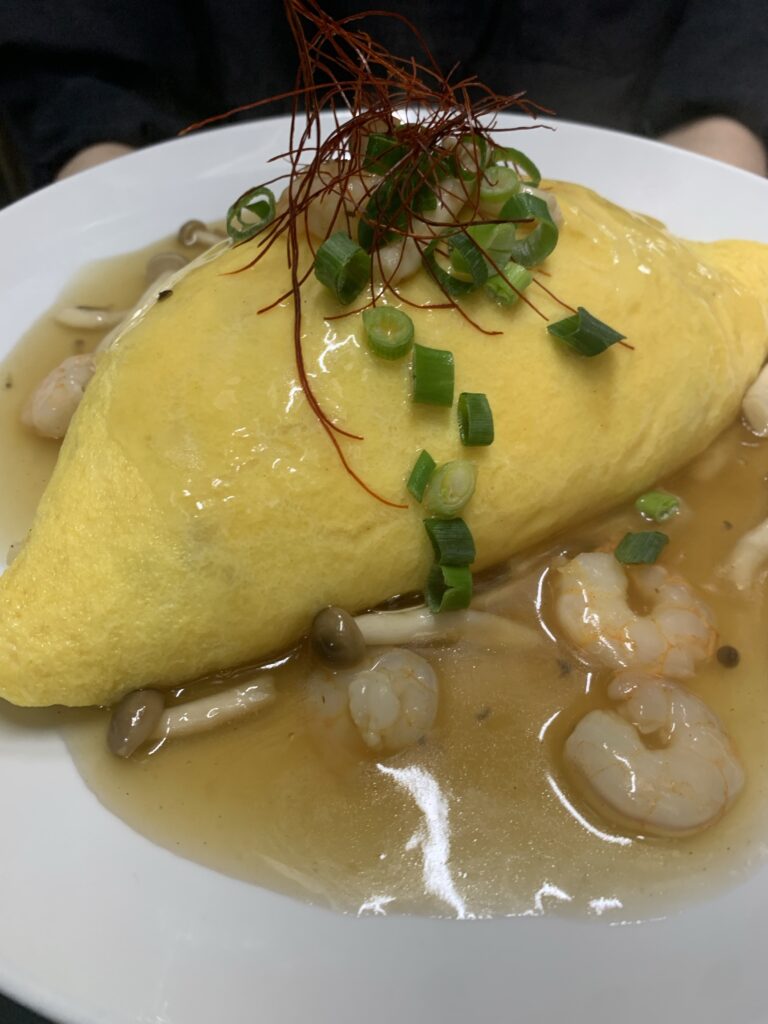 遅くなりましたが、本日の日替わりオムライスは、エビときのこの和風ソースオムライスです❗