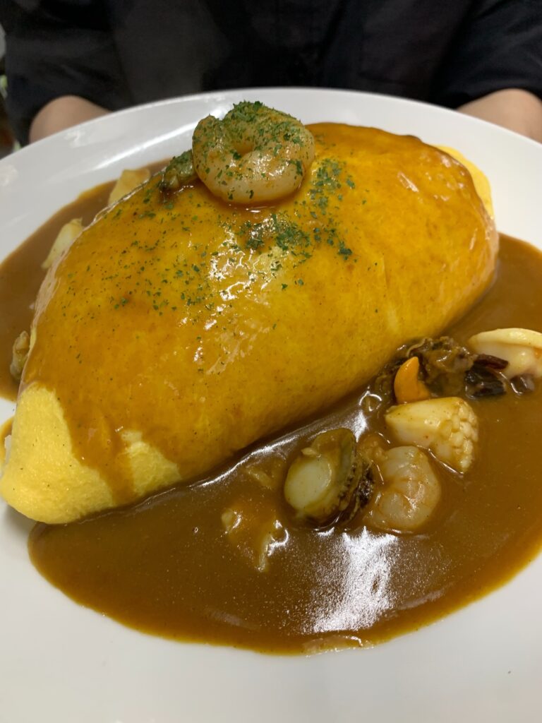 遅くなりましたが、4/9の日替わりオムライスは、魚介のカレーオムライスです❗