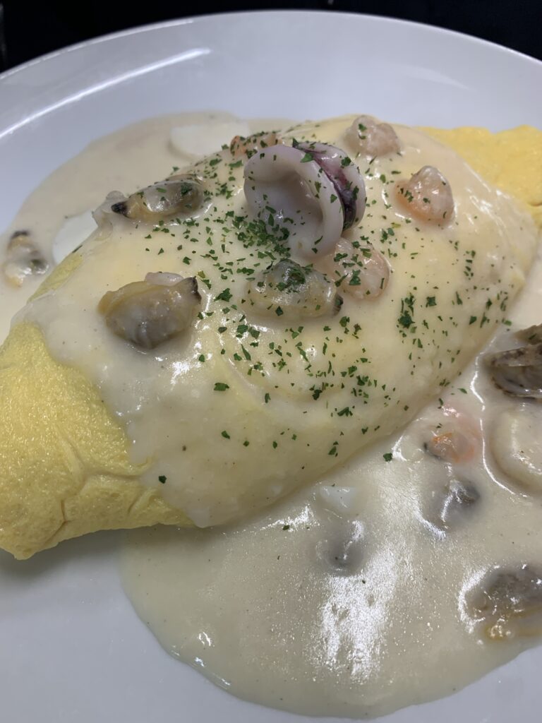 4/24の日替わりオムライスは、魚介のクリームソースオムライスです❗
