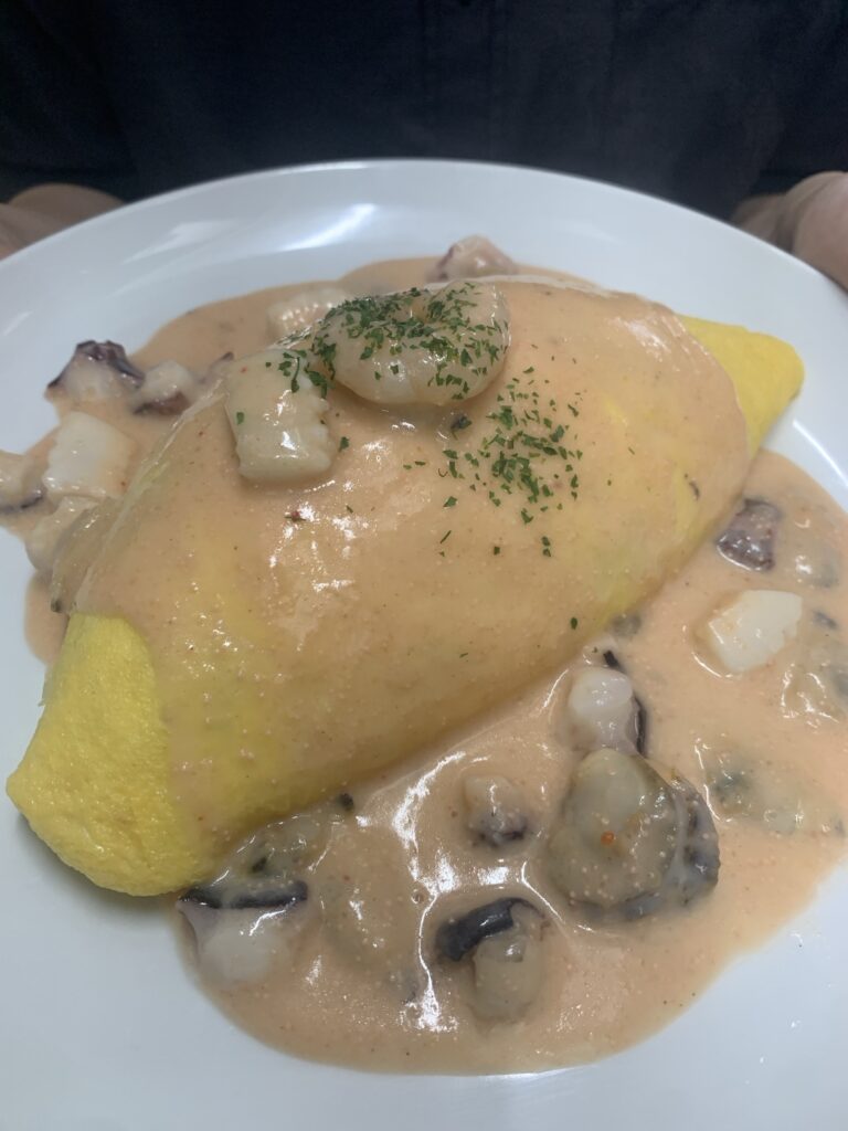 シャケと塩昆布とキャベツの和風ソースオムライス