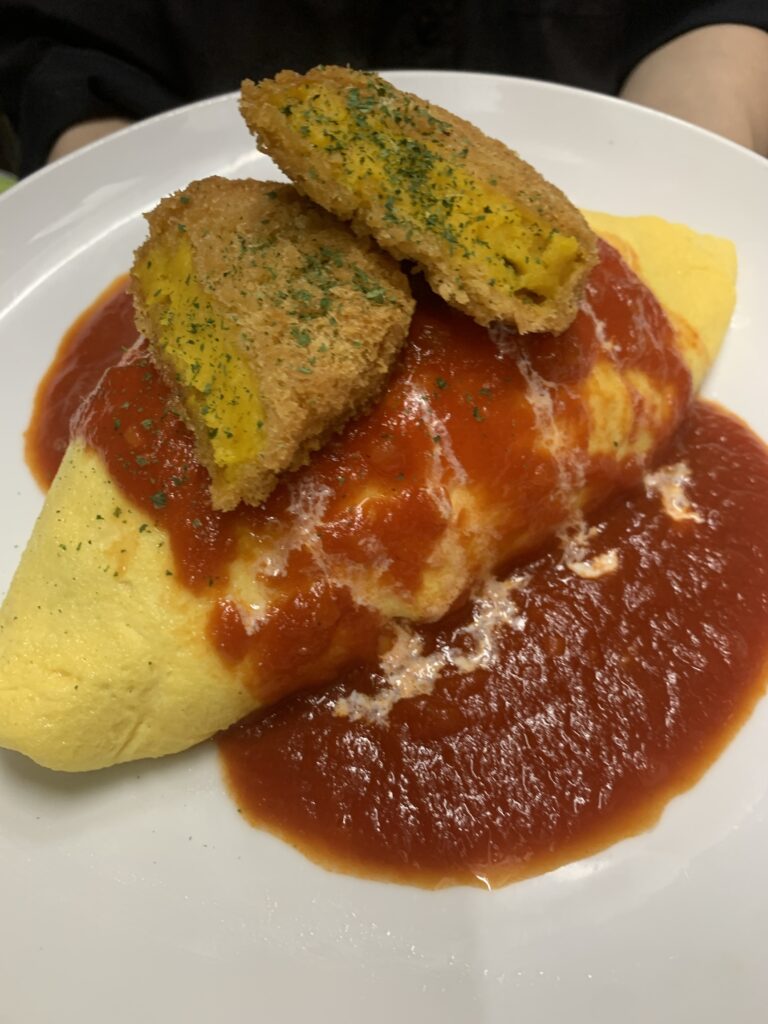 さて3/1の日替わりオムライスは、かぼちゃコロッケのせトマトソースオムライスです❗